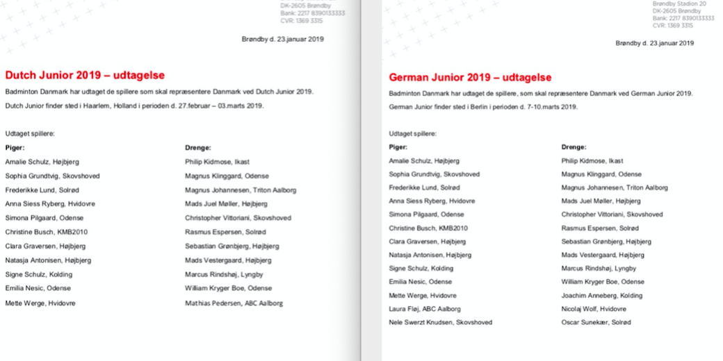 Amalie Schulz, Clara Graversen, Natasja Antonisen, Sebastian Grønbjerg, Mads Vestergaard og Mads Juel Møller er alle udtaget til både Dutch Junior 2019 og German Open 2019. Dutch er 27 feb. – 3. marts i Haarlem, Holland og German er 10.-17. marts i Berlin. Stort tillykke til jer, og held og lykke til Danmark.
