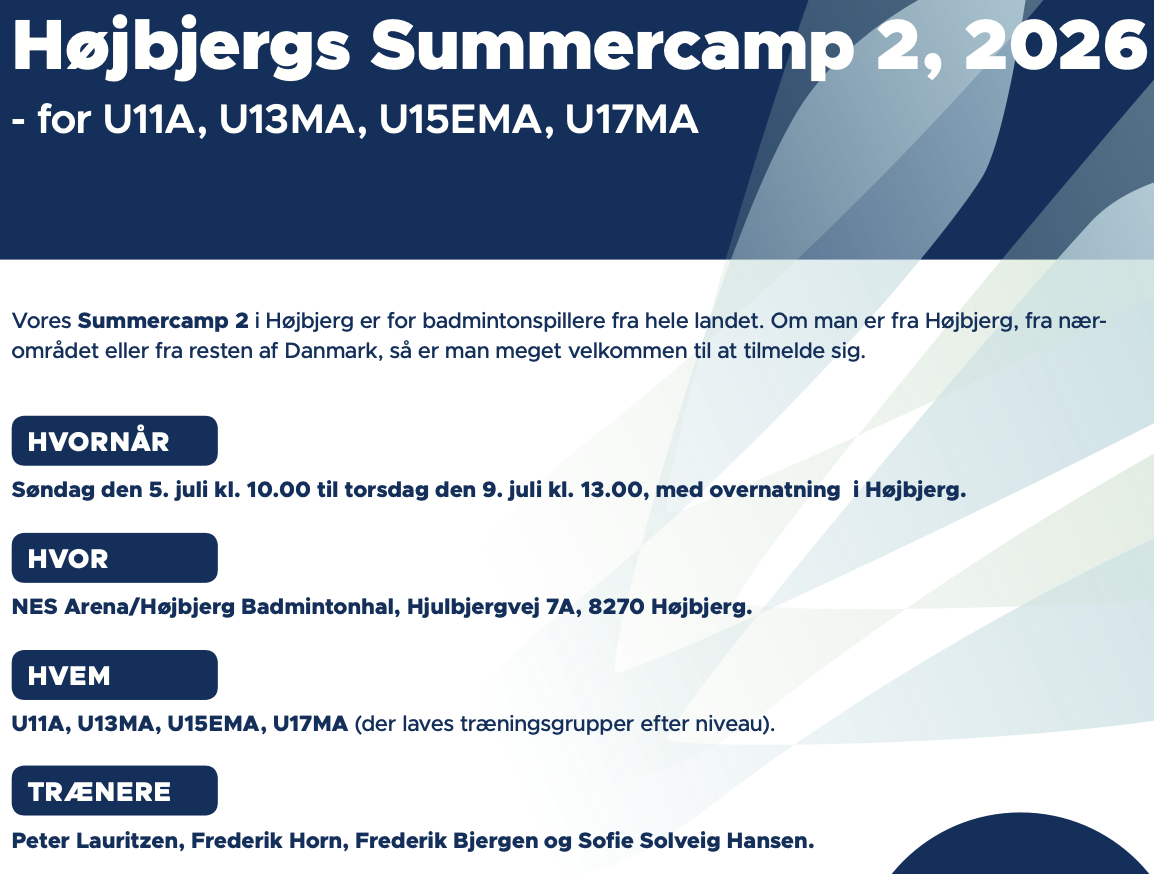 Vores Summercamp 2 i Højbjerg i er for badmintonspillere fra hele landet. Om man er fra Højbjerg, fra nærområdet eller fra resten af Danmark, så er man meget velkommen til at tilmelde sig.