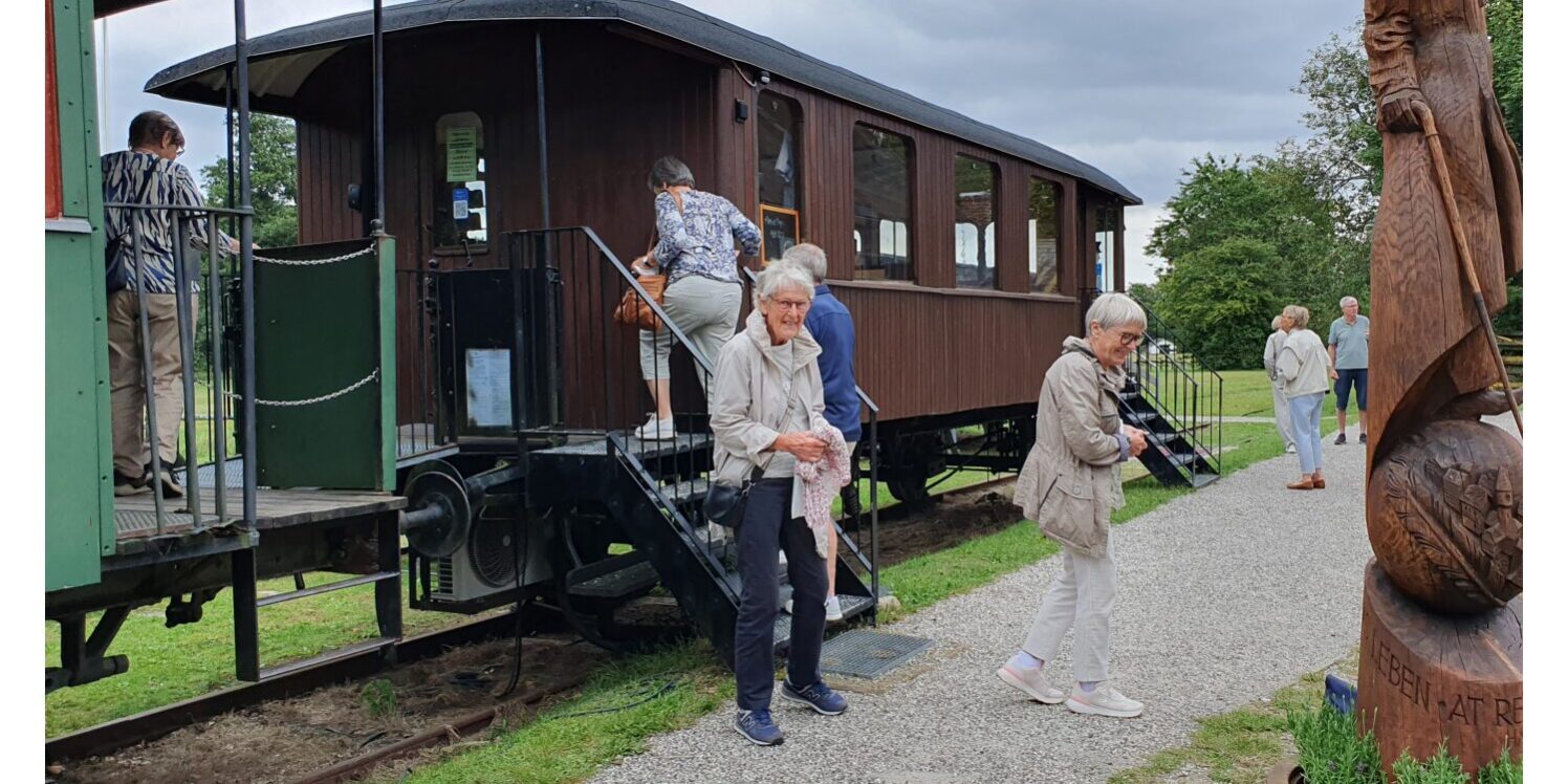 Gennem det smukke landskab med bløde bakker og skove kørte vi til Bindeballe købmandsgård, hvor der var gjort klar til vores frokost. På 1. sal var der et lille museum, men selve butikken var også et museum med gamle ting og sager, som man kunne bruge tid på at opleve og måske købe lidt med hjem. Vi gik også over på den anden side af vejen; her var den gamle jernbanestation med gamle togvogne, der er restaureret og nu bliver brugt til selskaber.